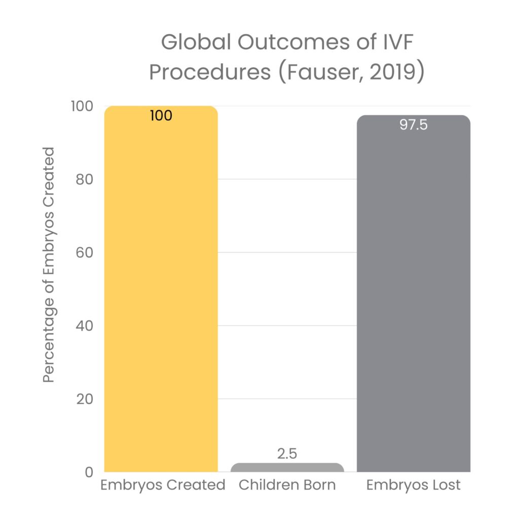 This means that between 96% and 97.5% of embryos created through IVF procedures lost their lives before birth. Some died naturally during the implantation process, others were eliminated through genetic selection, and others were considered “surplus” and destroyed or frozen indefinitely.