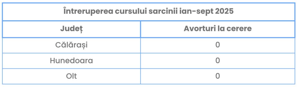 The phenomenon of underreporting is not a thing of the past, but continues today. For example, in the first nine months of 2025 (January–September), zero abortions on demand were officially reported in the counties of Călărași, Hunedoara, and Olt, which raises serious questions about the accuracy of the statistical data. [1]
